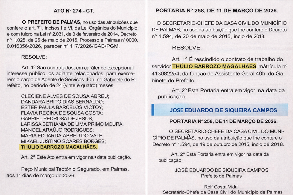 A edição nº 3.912 do Diário Oficial do Município de Palmas, publicada em 11 de março de 2026, revela uma situação administrativa incomum: um servidor aparece com contrato rescindido e novamente contratado na mesma edição, além da admissão de 10 servidores temporários para atuação no Gabinete do Prefeito.