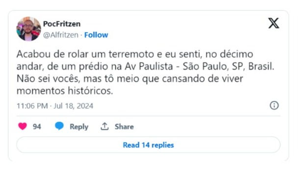 Nas redes sociais, brasileiros relataram terem sentido o imóvel tremer e publicaram vídeos de plantas e de objetos balançando (veja abaixo).