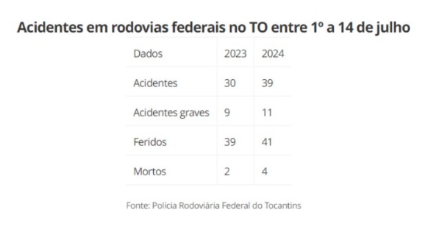 Os dados da Polícia Rodoviária Federal do Tocantins, são referentes ao período de 1º a 14 de julho. Em 2023, o número de acidente nesse mesmo período foi menor, segundo o levantamento. Nesse período, foram registrados 30 casos em que 39 pessoas ficaram feridas e duas morreram. Veja os dados abaixo: